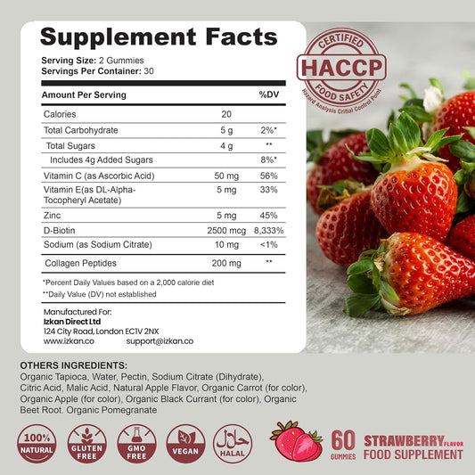 Collagen Gummies with Zinc, Biotin, Vitamin C & E – Type 1 Hydrolysed Collagen for Hair, Glowing Skin Nails & Joint Support – High Absorption, Gluten-Free, Natural Strawberry Flavour – 60 Gummies