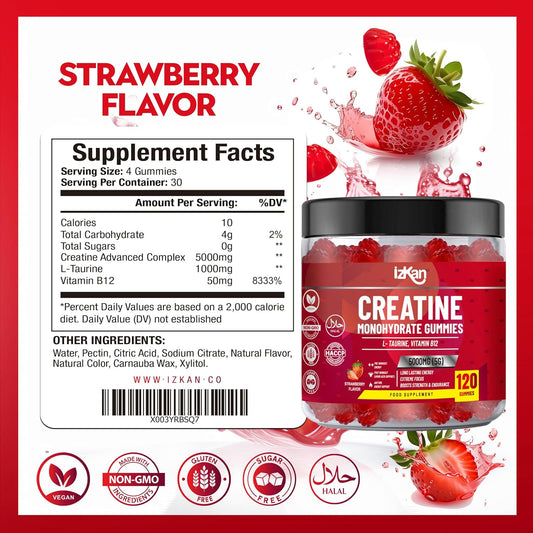 izkan Creatine Monohydrate Gummies, 5000mg (5G) per serving, 120 Sugar-Free, Halal, Vegan Strawberry Flavor
